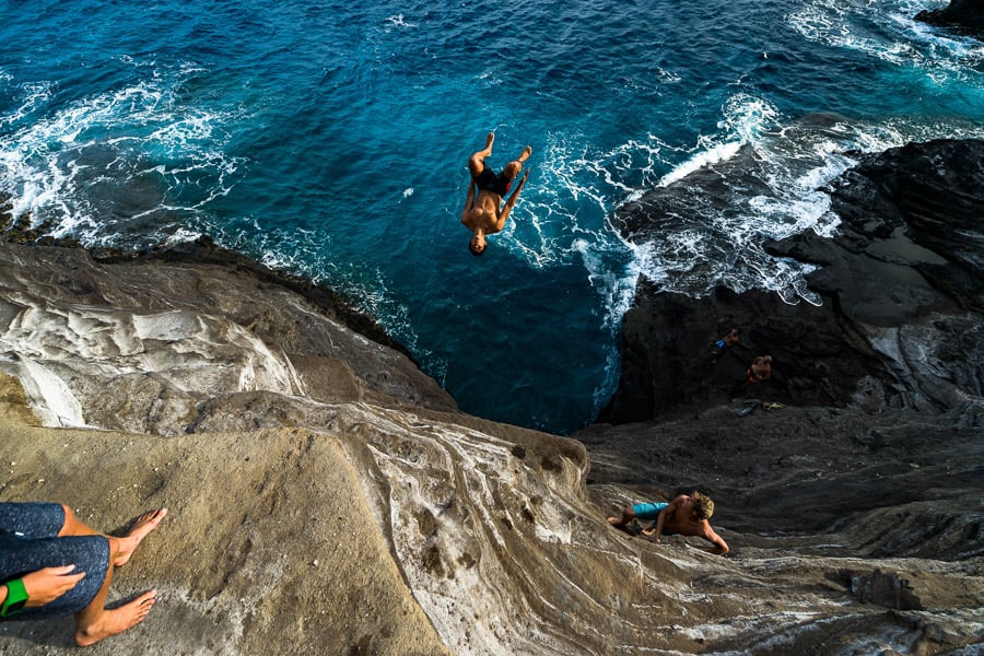 Test your bravery at Spitting Caves, a 60-foot jump into deep ocean waters, perfect for experienced cliff jumpers. This hidden spot in Hawaii Kai offers dramatic scenery and an adrenaline-filled fun.